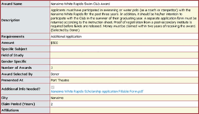 To apply for this award please complete this additional application: Nanaimo White Rapids Scholarship Application Fillable Form This application should be submitted to your school contact along with your general application.